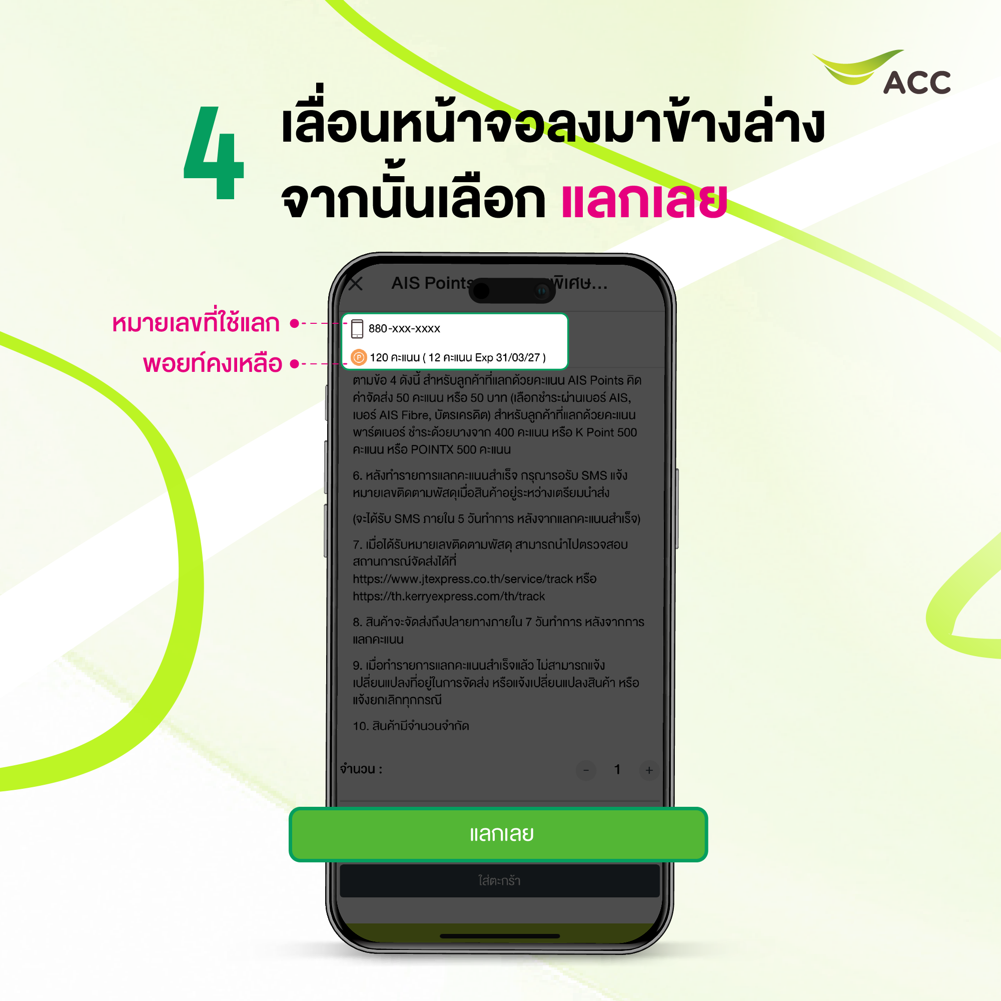 5. เลือก พอยท์ที่จะใช้แลก จากนั้นเลือก ช่องทางชำระค่าบริการจัดส่ง แล้วกด แลกคะแนน