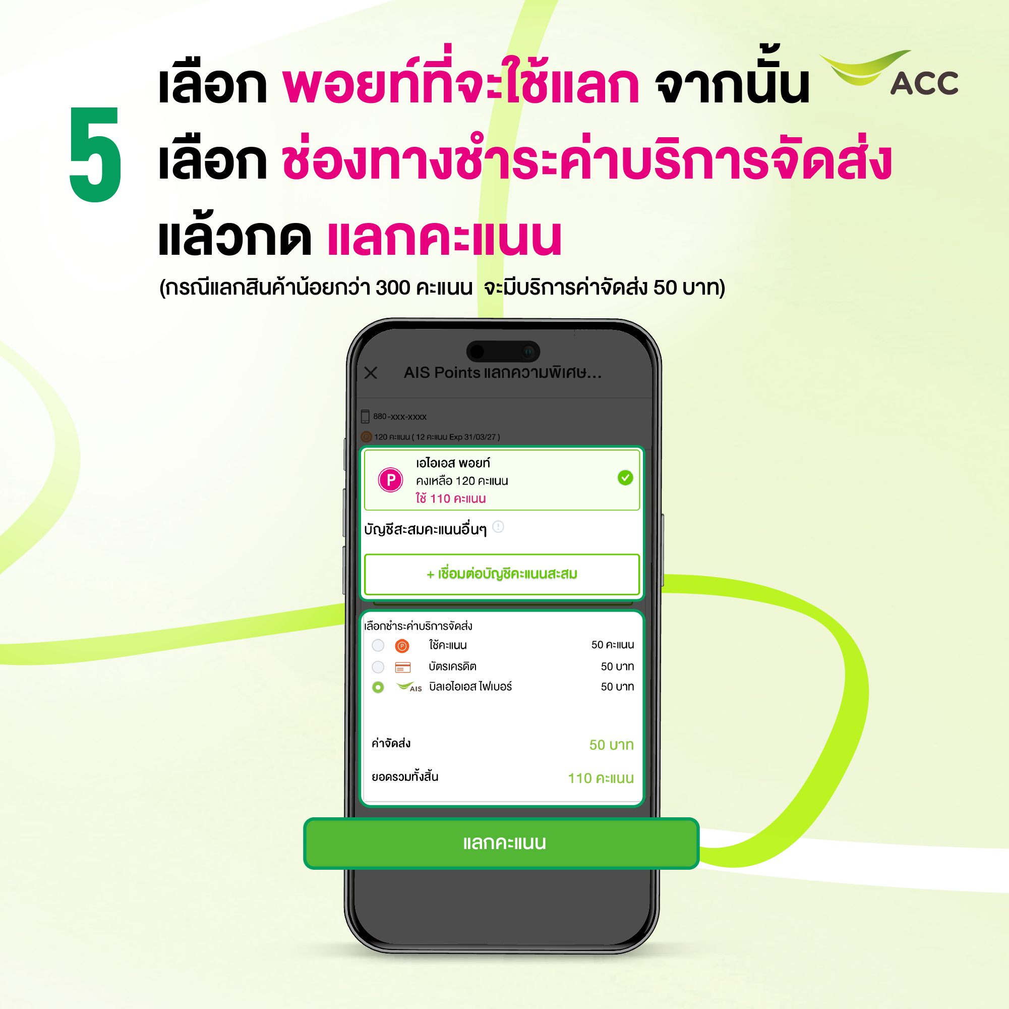 กรณีแลกสินค้าน้อยกว่า 300 คะแนน คิดค่าบริการจัดส่ง 50 บาท โดยสามารถเลือกชำระผ่านเบอร์เอไอเอส (ทั้งแบบรายเดือนและเติมเงิน), เบอร์เอไอเอส ไฟเบอร์, บัตรเครดิต หรือชำระเป็นเอไอเอส พอยท์ 50 คะแนน