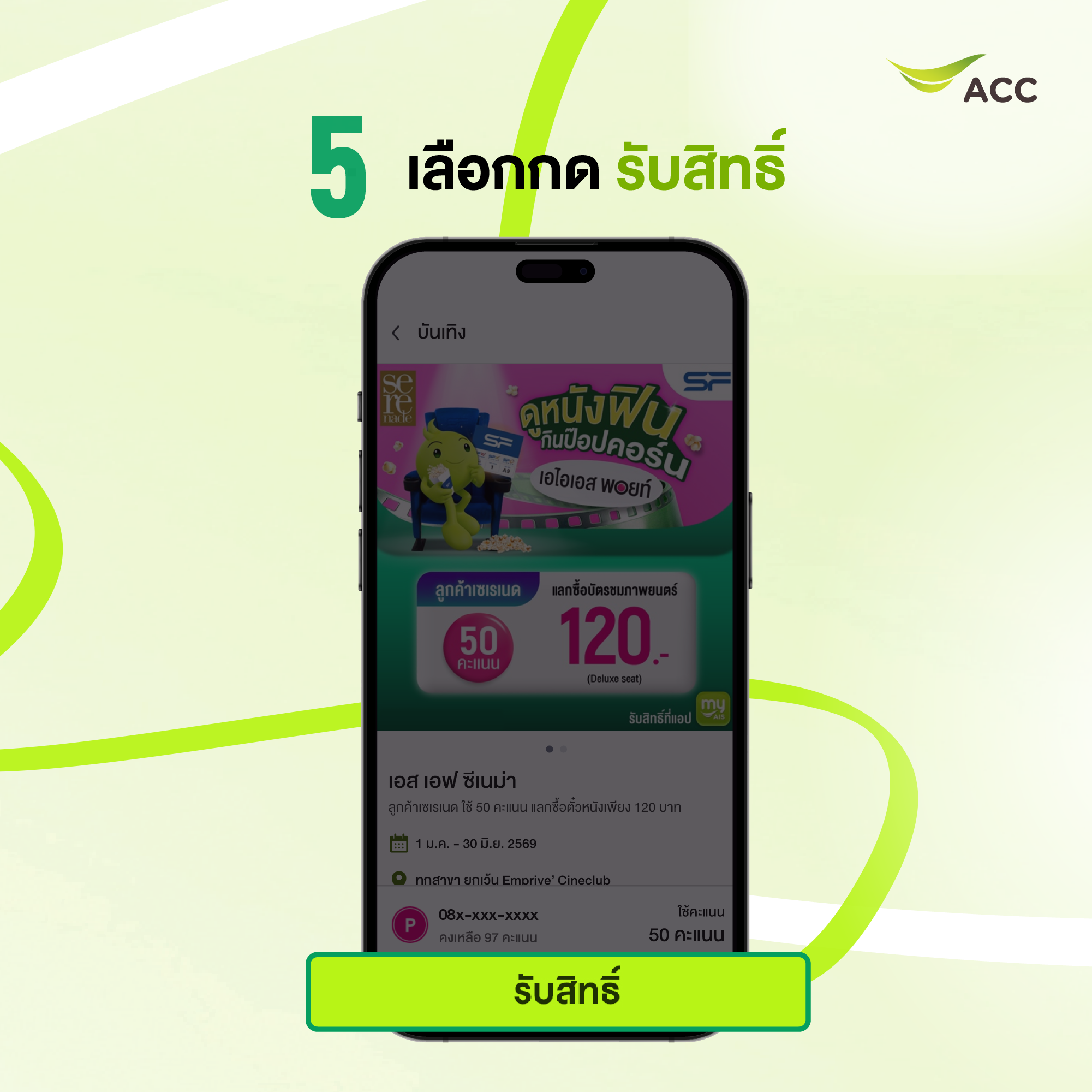 วิธีการรับสิทธิ์ดูหนังใช้ 50 คะแนน แลกซื้อตั๋วหนัง SF เพียง 120 บาท พิเศษสำหรับลูกค้า AIS Serenade รับสิทธิ์ดูหนังเข้าใหม่ ทุกเรื่อง ทุกรอบ กดรับสิทธิ์ผ่านแอปพลิเคชัน myAIS