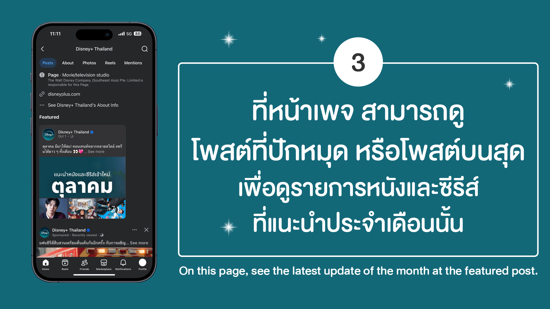 - ที่หน้าเพจ สามารถดูข้อมูลรายการหนังและซีรีส์ที่แนะนำประจำเดือนนั้น ได้ที่โพสต์ปักหมุด