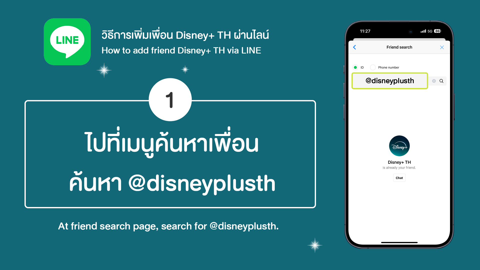 - ไปที่เมนูค้นหาเพื่อน ค้นหา @disneyplusth