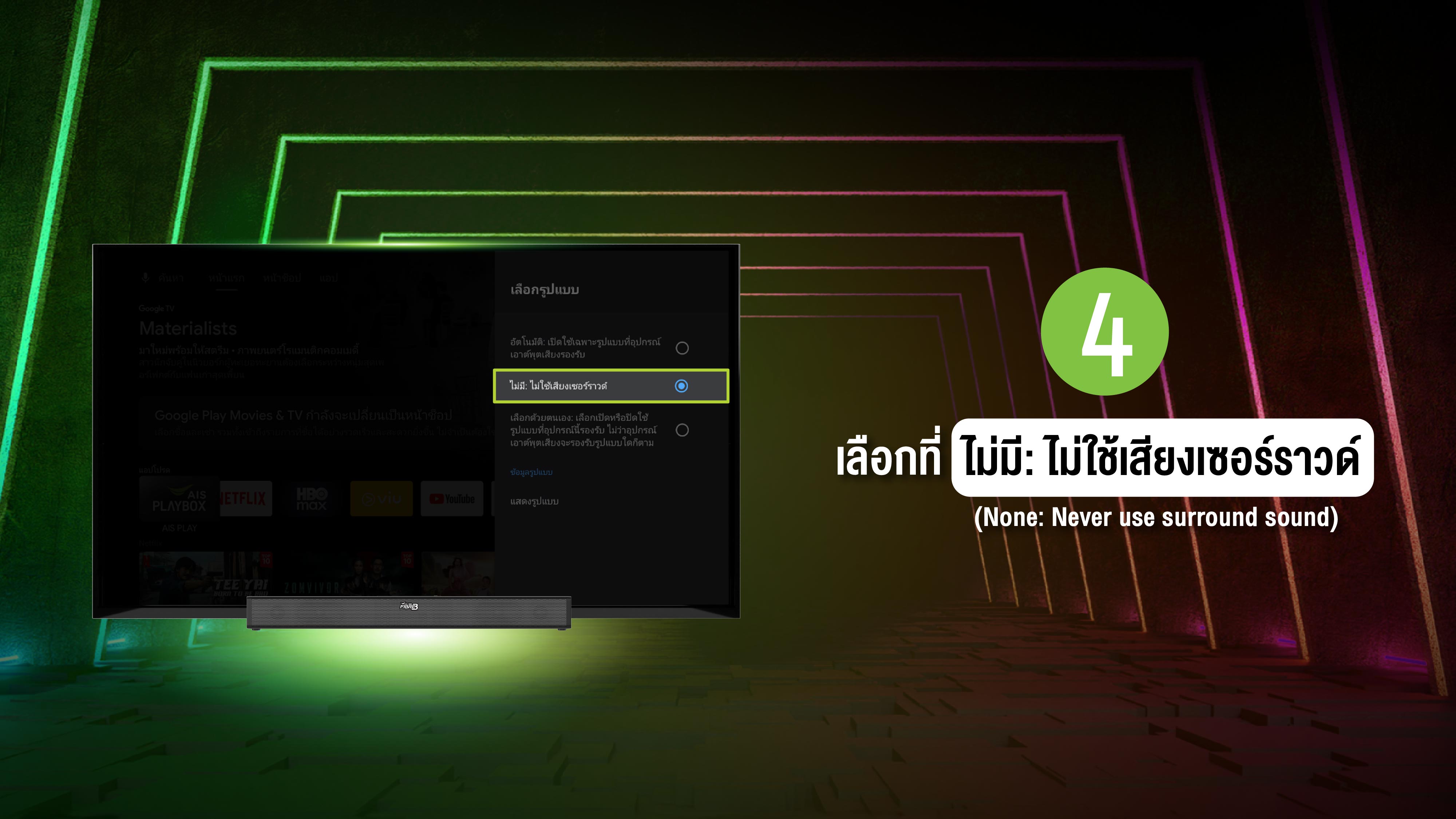 4. เลือกที่ ไม่มี: ไม่ใช้เสียงเซอร์ราวด์(None: Never use surround sound)
