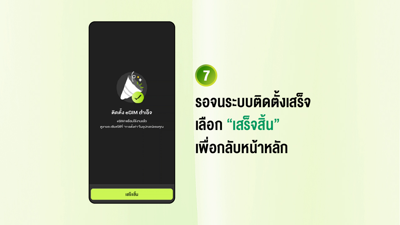 ที่หน้าหลักเลือก เพิ่มเติม > เปิดใช้งานซิม > ติดตั้ง eSIM > ระบุเลขที่ซิม และเบอร์โทรศัพท์