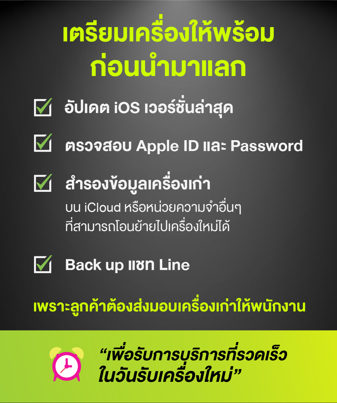 A. ประหยัดเวลา ไม่ต้องรอคิวประเมินเครื่องในวันที่มารับ iPhone เครื่องใหม่