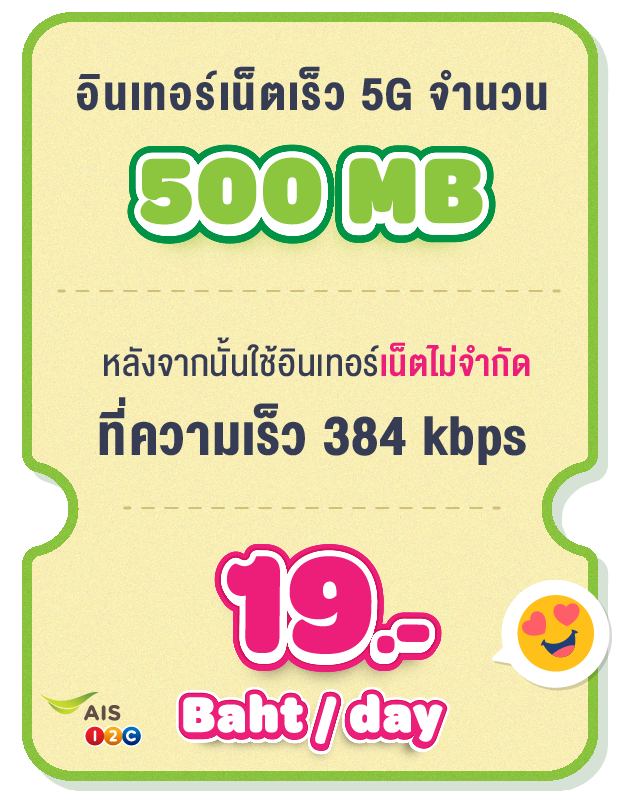 • ใช้งานอินเทอร์เน็ต 5G เป็นจำนวน 500MB หลังจากนั้นใช้งานได้ไม่จำกัดที่ความเร็ว 384 kbps