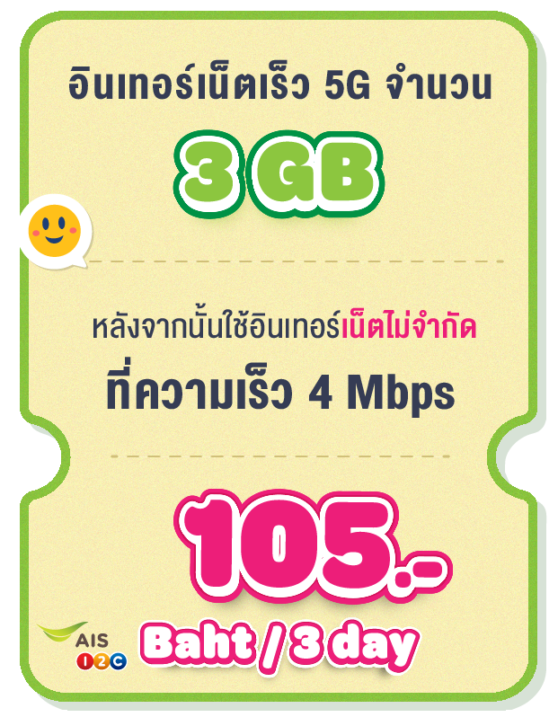 • ใช้งานอินเทอร์เน็ต 5G/4G เป็นจำนวน 3 GB หลังจากนั้นใช้งานได้ไม่จำกัดที่ความเร็ว 4 Mbps