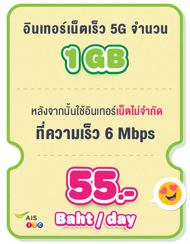 • ใช้งานอินเทอร์เน็ต 5G/4G เป็นจำนวน 1GB หลังจากนั้นใช้งานได้ไม่จำกัดที่ความเร็ว 6 Mbps