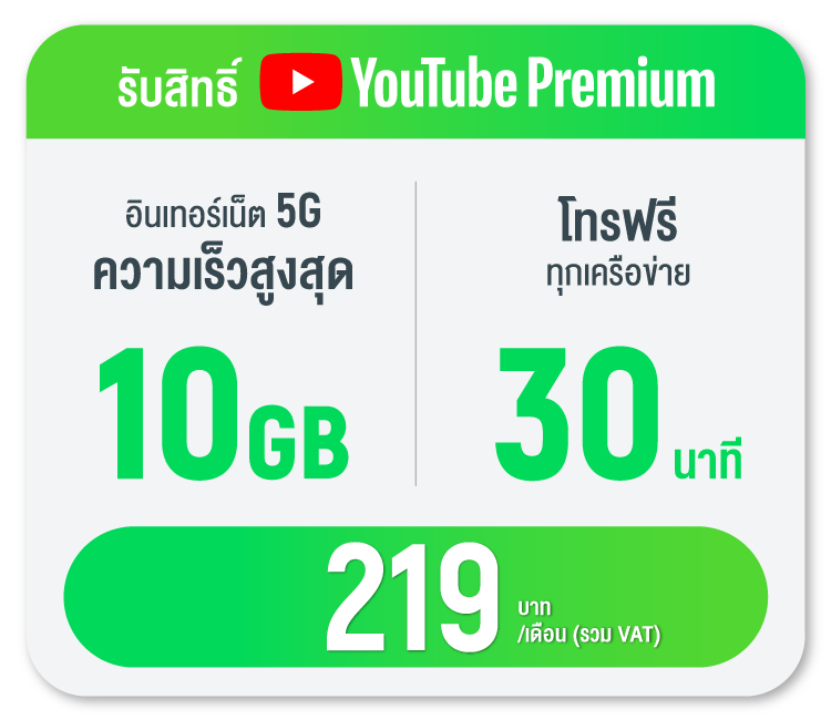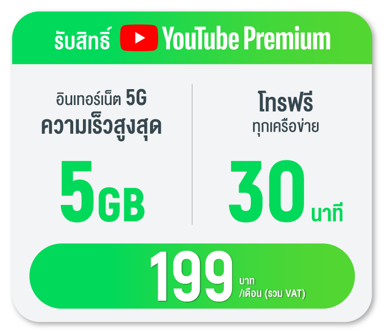 แพ็กเกจเสริมเน็ต 5G พร้อมสิทธิ์ใช้งาน YouTube Premium เริ่มต้น 199 บ./เดือน