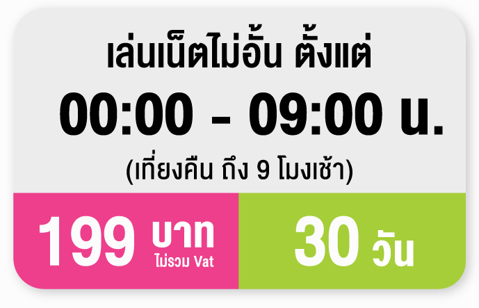 แพ็กเกจเสริมเน็ตช่วงเวลา 00.00–09.00 น. เล่นเน็ตได้จุใจ ดูคลิป ฟังเพลง เล่นโซเชียลได้สบาย เน็ตลื่น คนใช้น้อย โหลดไว ไม่สะดุด ใช้เน็ตให้คุ้ม ต้องใช้ให้ถูกเวลาแพ็กนี้เหมาะกับสายดึกตัวจริง!