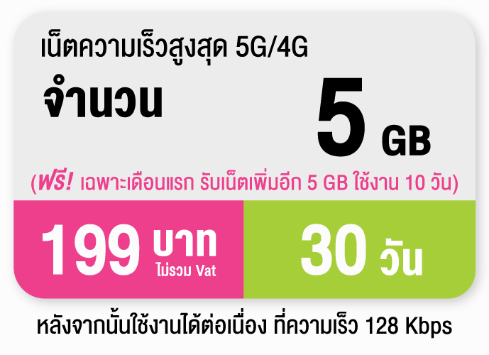 กับแพ็กเสริมเน็ตความเร็วสูง 5G/4G 5GB ราคาเพียง 199 บาท (ยังไม่รวม Vat) ใช้งานได้นาน 30 วัน