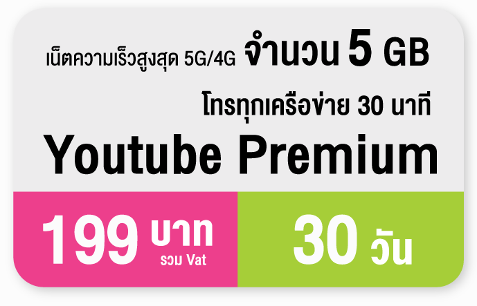 ถ้าคุณเป็นคนชอบดู YouTube ดูเพลิน ดูยาว ดูได้ทั้งวัน ไม่ว่าจะดูคลิปบันเทิง ฟังเพลง ดูรีวิว หรือดูไลฟ์สด แพ็กเกจนี้ตอบโจทย์สุดๆ เพราะได้ สิทธิ์ใช้ YouTube Premium ที่สามารถดูวิดีโอyoutube โดยไม่มีโฆษณาคั่น เล่นวีดีโอได้ ขณะล็อกหน้าจอหรือขณะใช้แอปอื่น และยังดาวน์โหลดวิดีโอเพื่อดูแบบออฟไลน์ได้อีกด้วย รวมไปถึงยังสามารถใช้งาน YouTube Music Premium ได้ด้วย พร้อมเน็ตความเร็วสูงสุด จำนวน 5 GB และได้โทรทุกเครือข่าย 30 นาที เพียง 199 บาท (รวม VAT)ใช้งานนาน 30 วัน