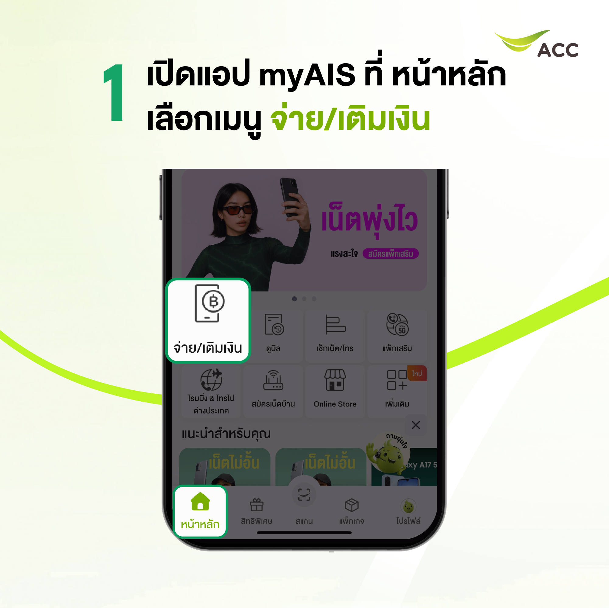 1. เข้าแอป myAIS ที่หน้าหลัก เลือกเมนู จ่าย/เติมเงิน