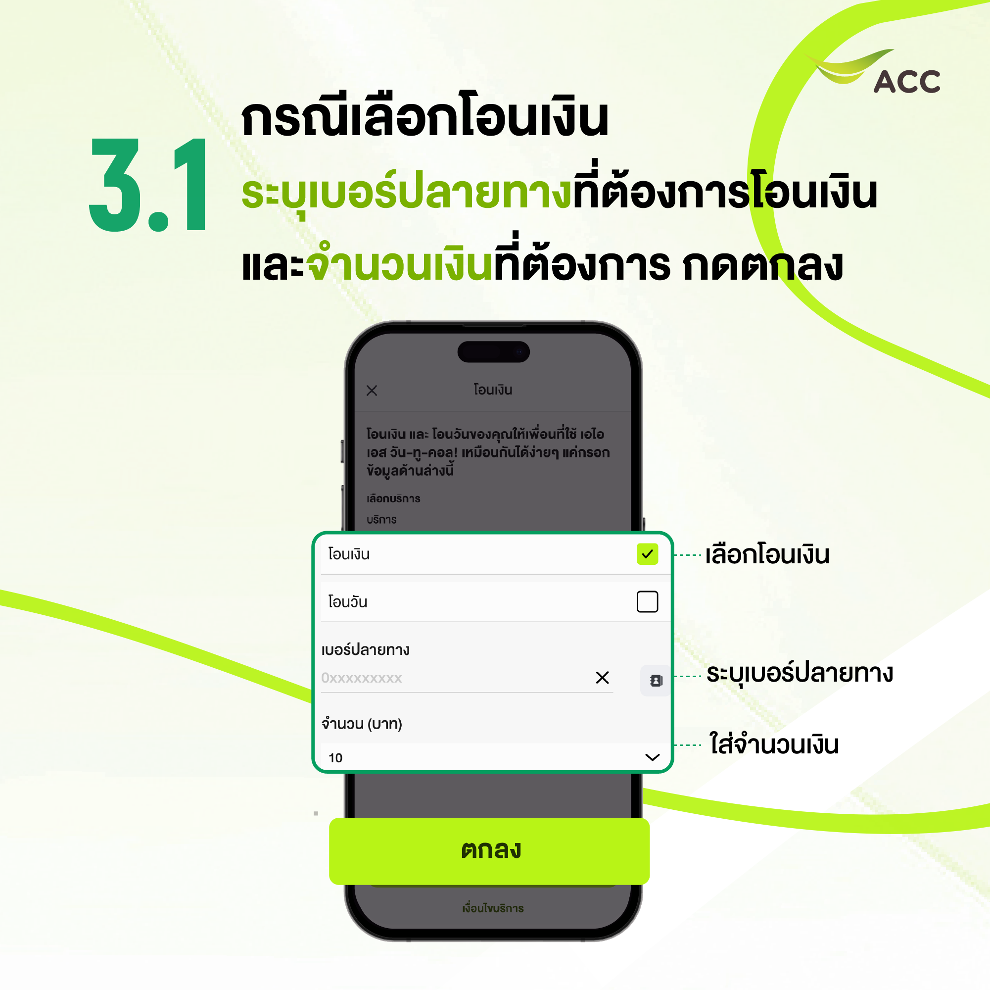 3.1 โอนเงิน - ระบุเลขหมายปลายทางวันทูคอล ที่ต้องการโอนเงิน และ จำนวนเงินที่ต้องการ จากนั้นกดตกลง