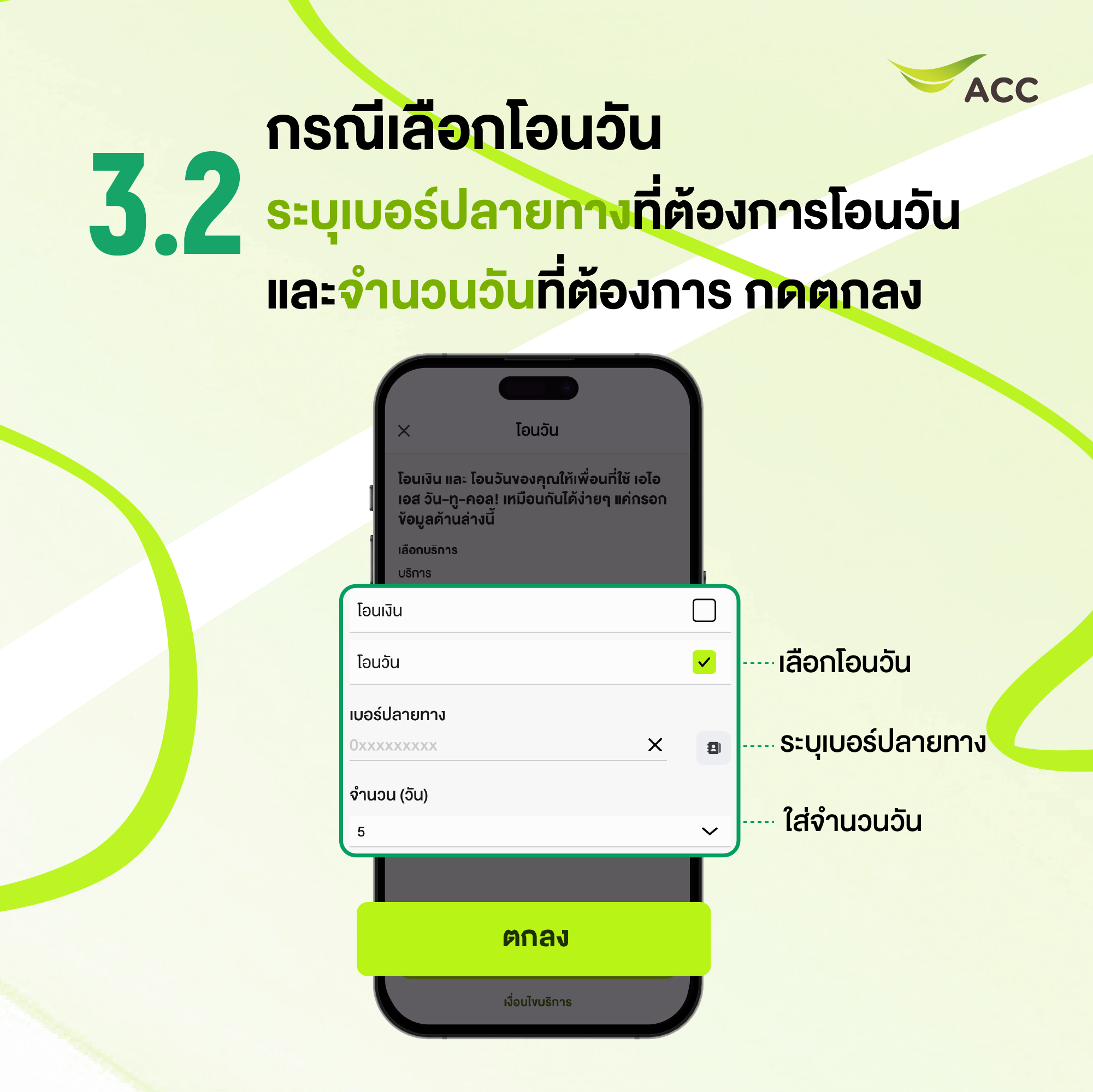 3.2 โอนวัน- ระบุเลขหมายปลายทางวันทูคอล ที่ต้องการโอนวัน และ จำนวนวันที่ต้องการ จากนั้นกดตกลง